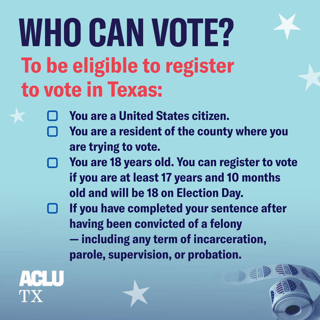 Eligibility requirements for voting in Texas are standard for U.S. states and are tied to citizenship and residency. To be eligible to register to vote, an individual must: