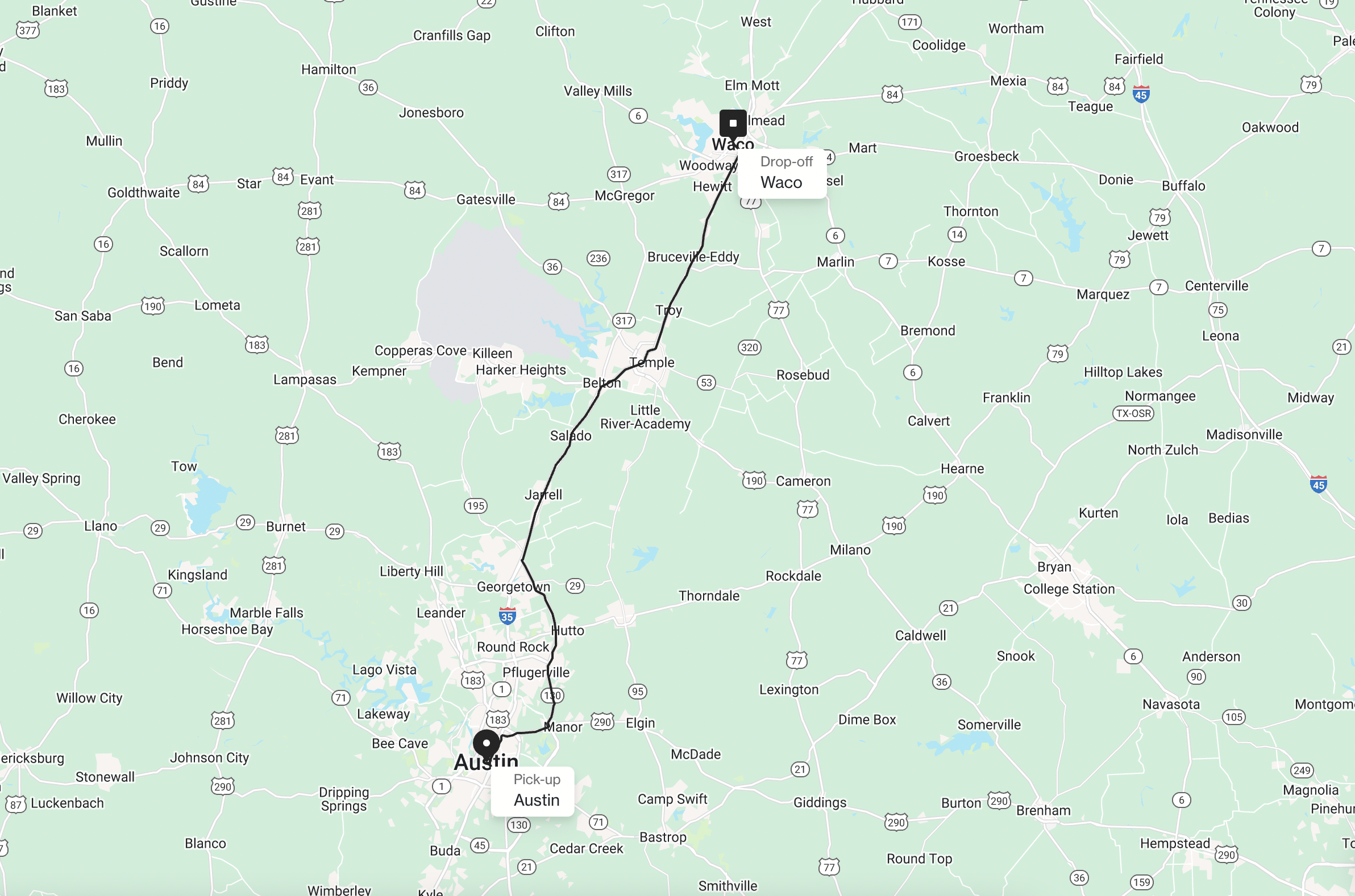 The most direct and commonly used route between [Austin] and [Waco] is via [I-35] North. This interstate highway is the primary artery connecting many major [Texas] cities and is generally well-maintained.